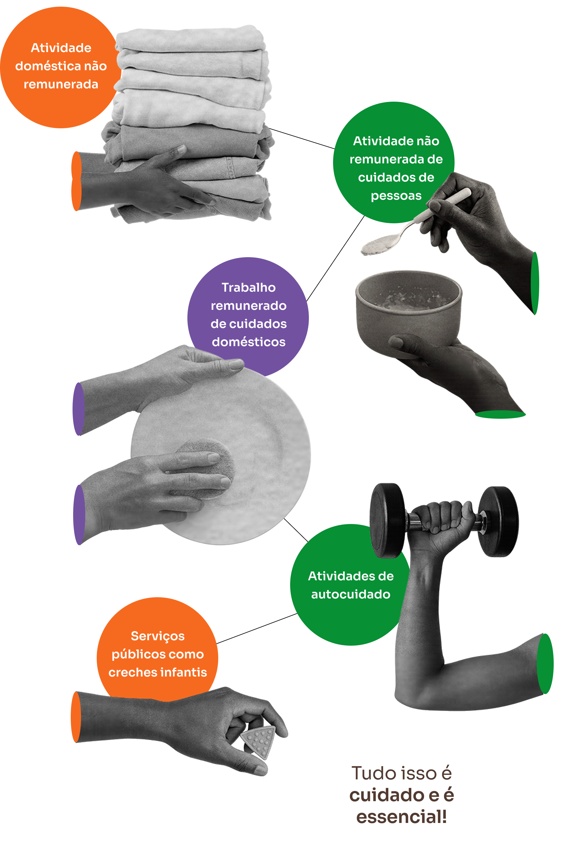 Percebeu que, como explicado no vídeo, o conceito de cuidado se torna cada vez mais complexo e rico? Uma atividade que, em sua maioria, acontece dentro dos lares é, na verdade, um trabalho essencial para o funcionamento de toda a sociedade (e muitas vezes invisível!).